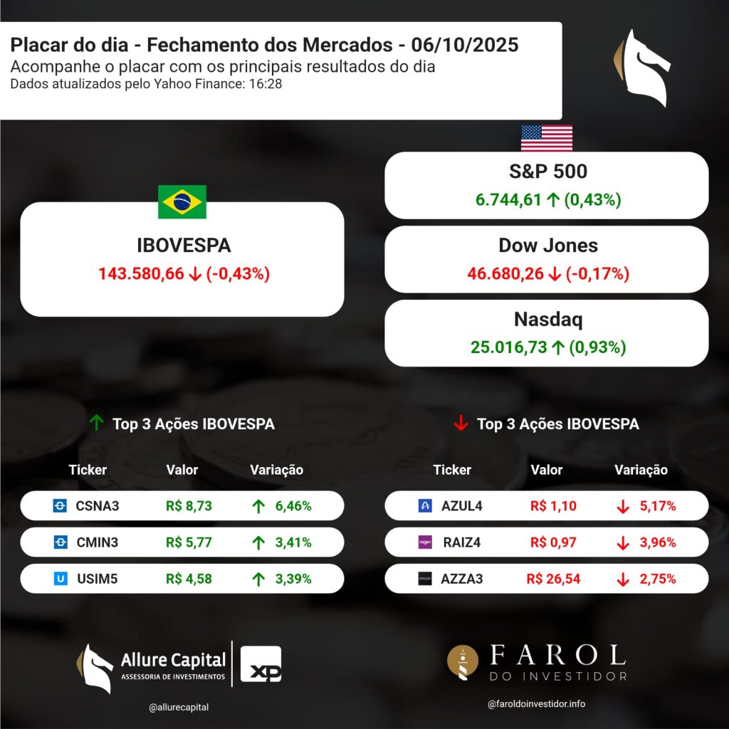 PLACAR DO DIA – Fechamento dos Mercados (06/10)