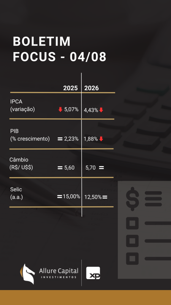 Com relação ao PIB para 2025, sua expectativa se manteve em 2,23%, pela quarta semana. Para 2026, a expectativa para o PIB teve queda em 1,88% pela primeira semana.