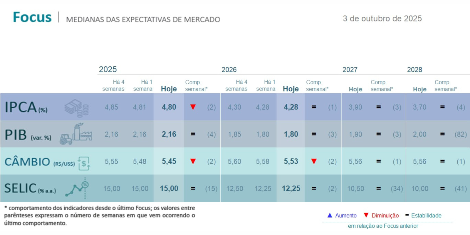 Com relação ao PIB para 2025, sua expectativa se manteve em 2,16%, pela quarta semana. Para 2026, a expectativa para o PIB se manteve em 1,80% pela terceira semana.