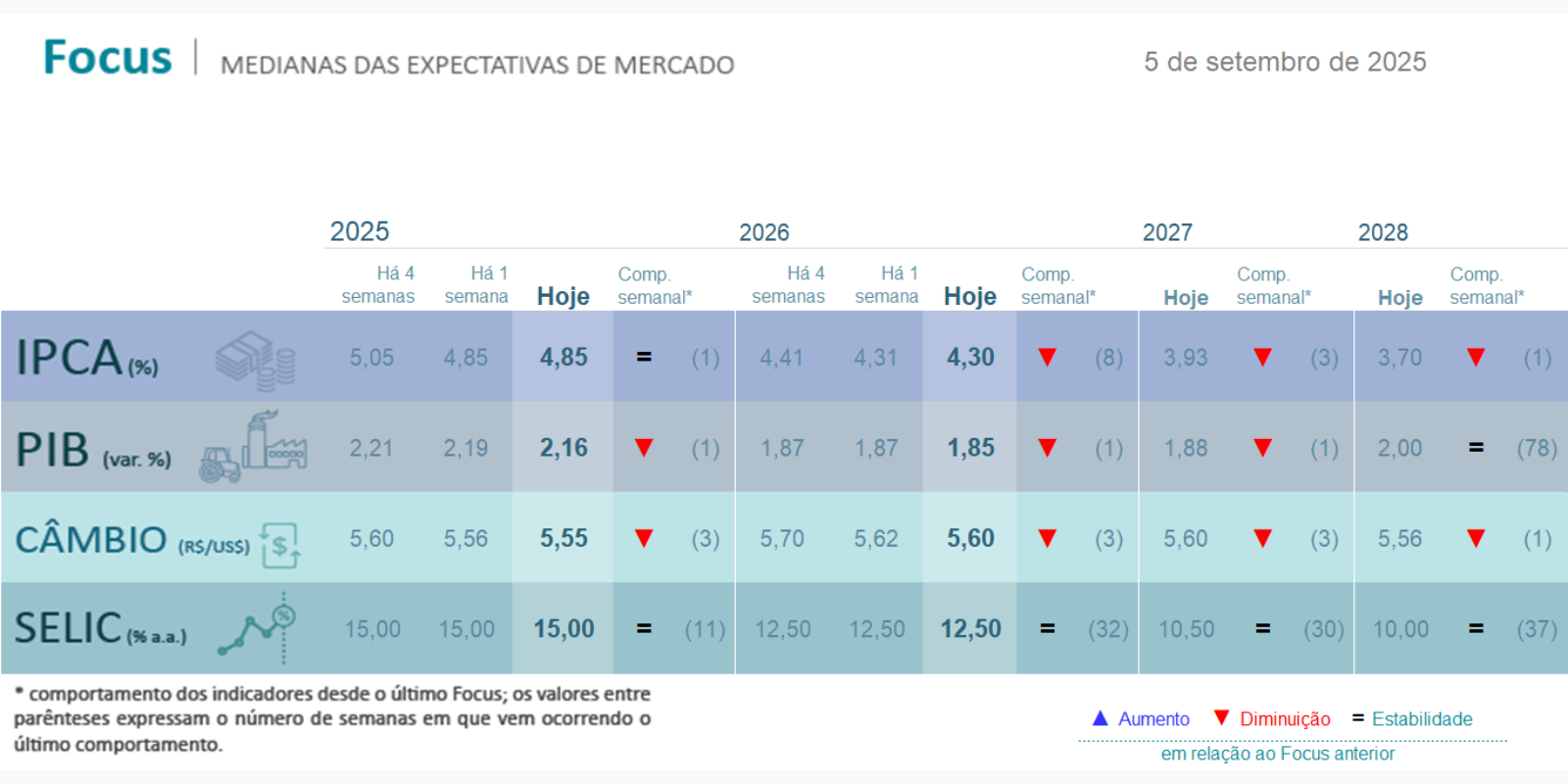 Quanto ao câmbio, paridade Dólar/Real, para 2025, estima-se um dólar equivalente a R$ 5,55 (expectativa teve queda com relação à semana anterior). Já para 2026, a expectativa é de R$ 5,60 (expectativa teve queda com relação à semana anterior).