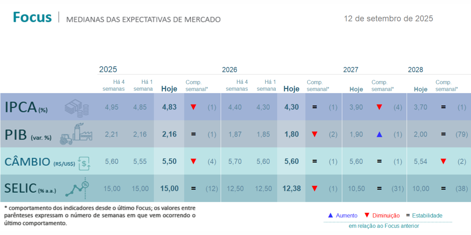 Com relação ao PIB para 2025, sua expectativa se manteve em 2,16%, pela primeira semana. Para 2026, a expectativa para o PIB teve queda em 1,80% pela segunda semana.
