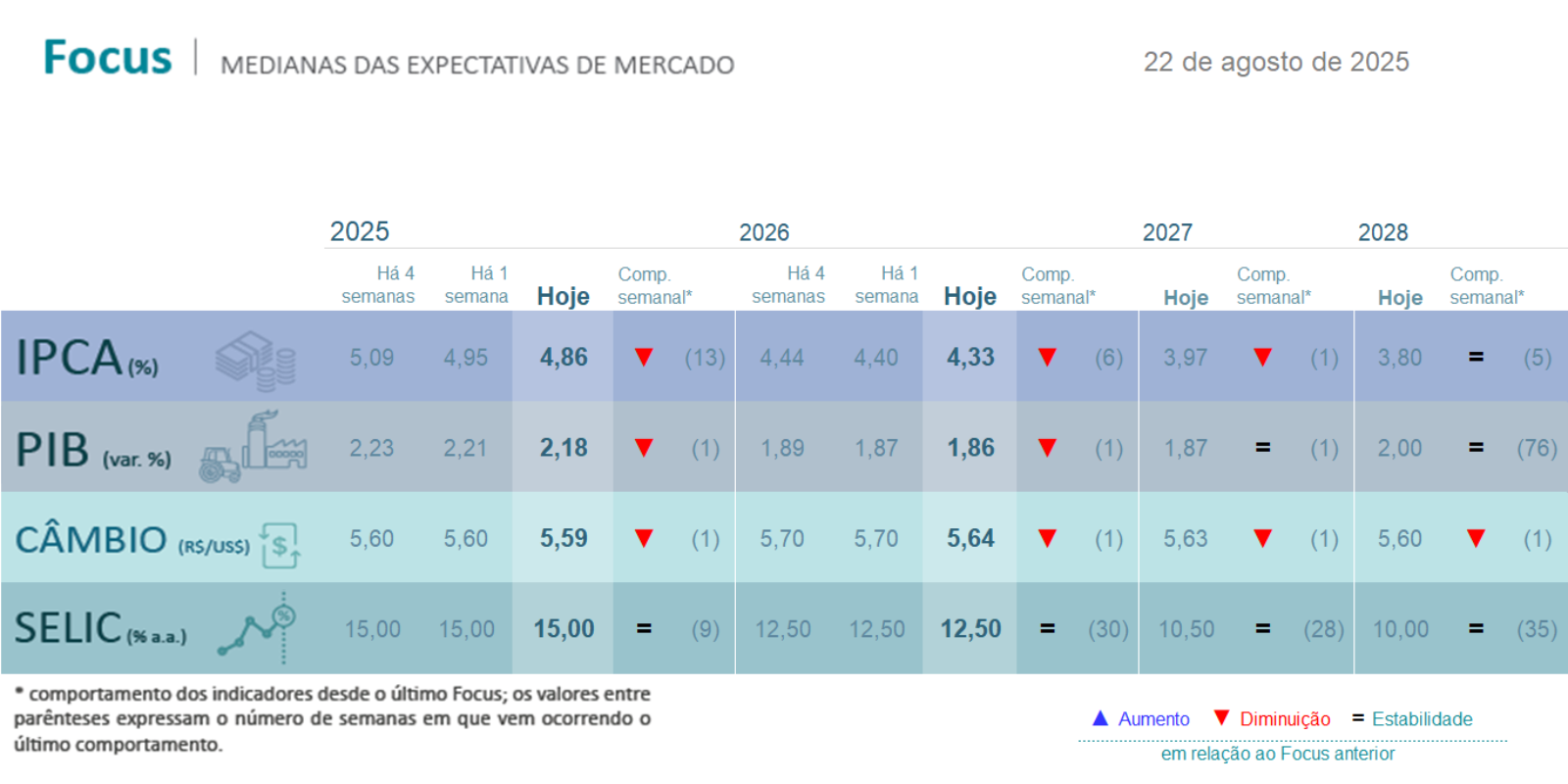 Quanto ao câmbio, paridade Dólar/Real, para 2025, estima-se um dólar equivalente a R$ 5,59 (expectativa teve queda com relação à semana anterior). Já para 2026, a expectativa é de R$ 5,64 (expectativa teve queda com relação à semana anterior).