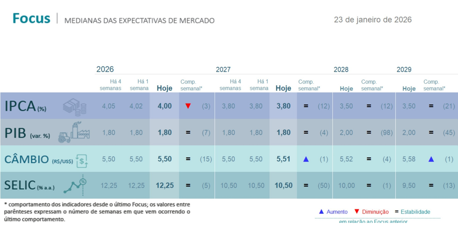 Pela terceira semana, o IPCA (principal índice de inflação) previsto para 2026 teve sua expectativa em queda ficando em 4,00%. Já o IPCA para 2027 teve sua expectativa mantida ficando em 3,80%, pela décima segunda semana.
